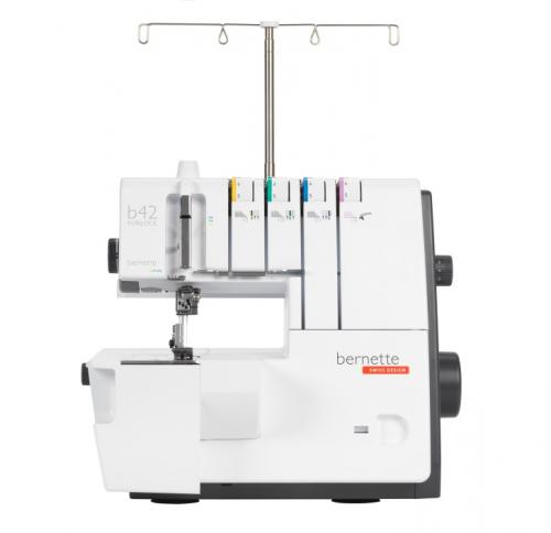 The bernette Funlock 42 is a coverstitch machine featuring a total of 3 different coverstitches with a width of 2.8 and 5.6 mm and a chain stitch. With it, you can provide your hems, edges and cuffs with professional stitches, giving your sewing project the perfect look. Excellent results can be achieved with the bernette Funlock 42, even with very stretchy fabrics and thin knitted fabrics. Threading the needles and loopers is also really easy, thanks to the separate needle threader and the looper threading mechanism. And to give you a good view of your sewing project, the bernette Funlock 42 also has a bright LED light.