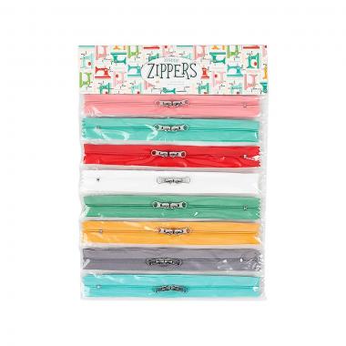My Happy Place Zippers are perfect for adding a cute finishing touch to yours bags, wallets, purses and project bags. With eight zippers in Lori Holt's signature colors to choose from, this pack of zippers has plenty of variety to match your vision. Includes eight different zippers with two zipper pulls each.