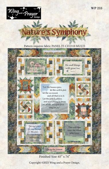 Nature's Symphony panel quilt is 65 x 74, includes standard piecing and requires PANELJT-CD2310 MULTI. Quilt uses 9 coordinating batiks from the Tonga Windsong collection.